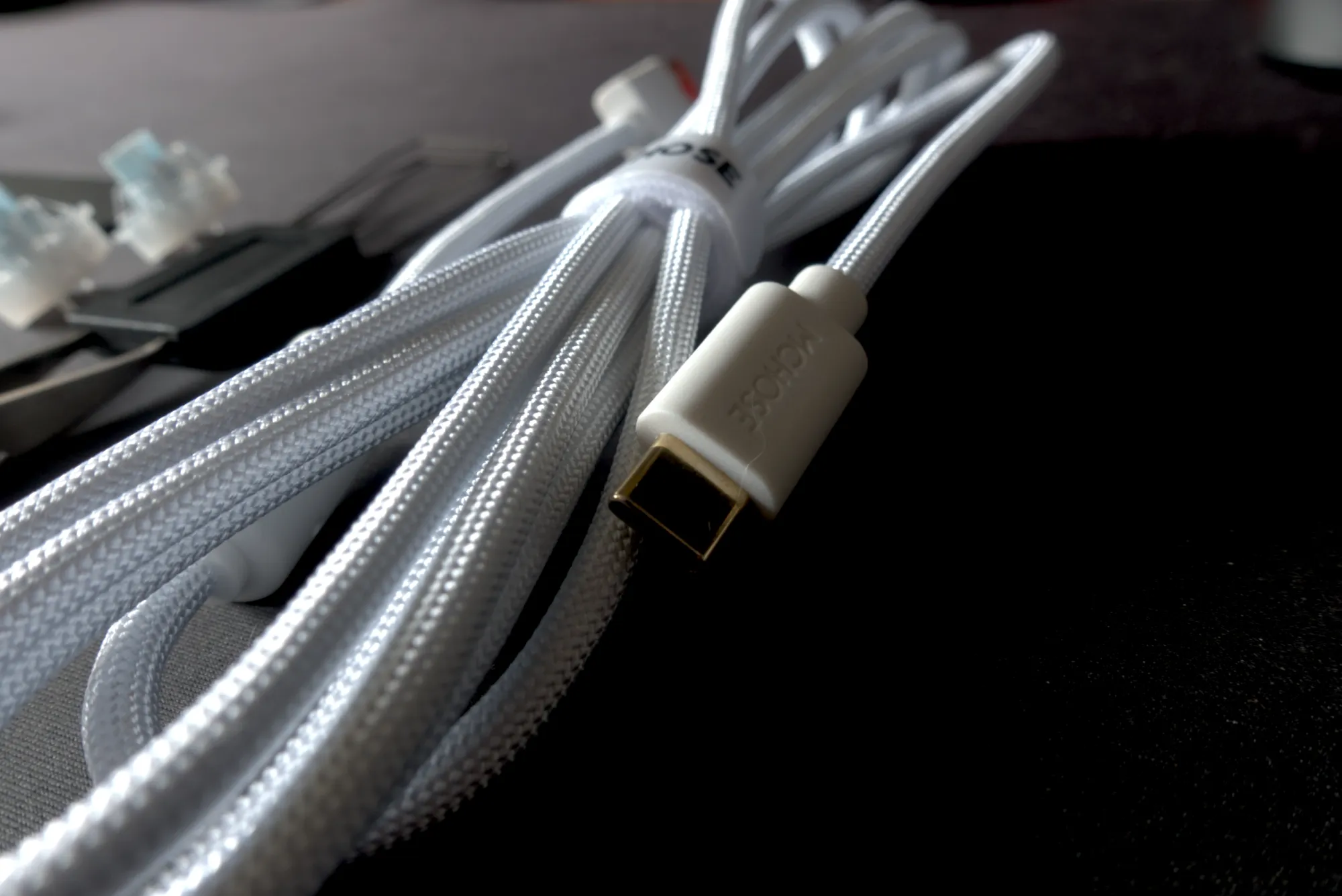 Le câble USB 2.0 fourni avec le clavier est un câble USB-A vers USB-C d'environ 2 mètres. Détail que j'apprécie, il est paracordé (bien que très générique voire cheap sur les bords) mais les connecteurs sont plaqués or, ce qui est toujours un petit plus dans la qualité, bien qu'uniquement esthétique. L'inclusion d'un petit stress-relief côté USB-A est toujours un petit plus, bien que non-nécessaire. Dans tous les cas, la conception de ce câble reste correcte.