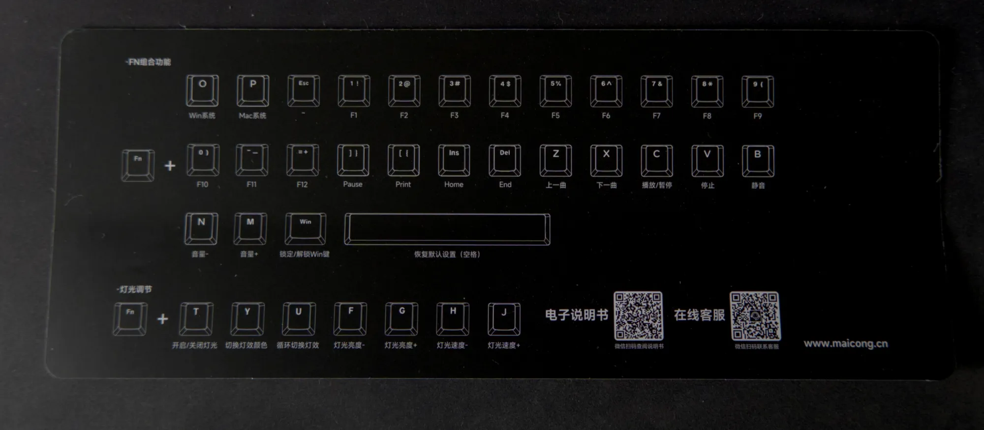 Devant le clavier se trouve un petit papier cartonné montrant le layout du clavier. A l'arrière se trouve un petit manuel rapide expliquant toutes les touches alternatives disponibles en maintenant la touche FN... Mais en chinois. Il y a aussi un QRCode pour les drivers/documentation et pour le support.