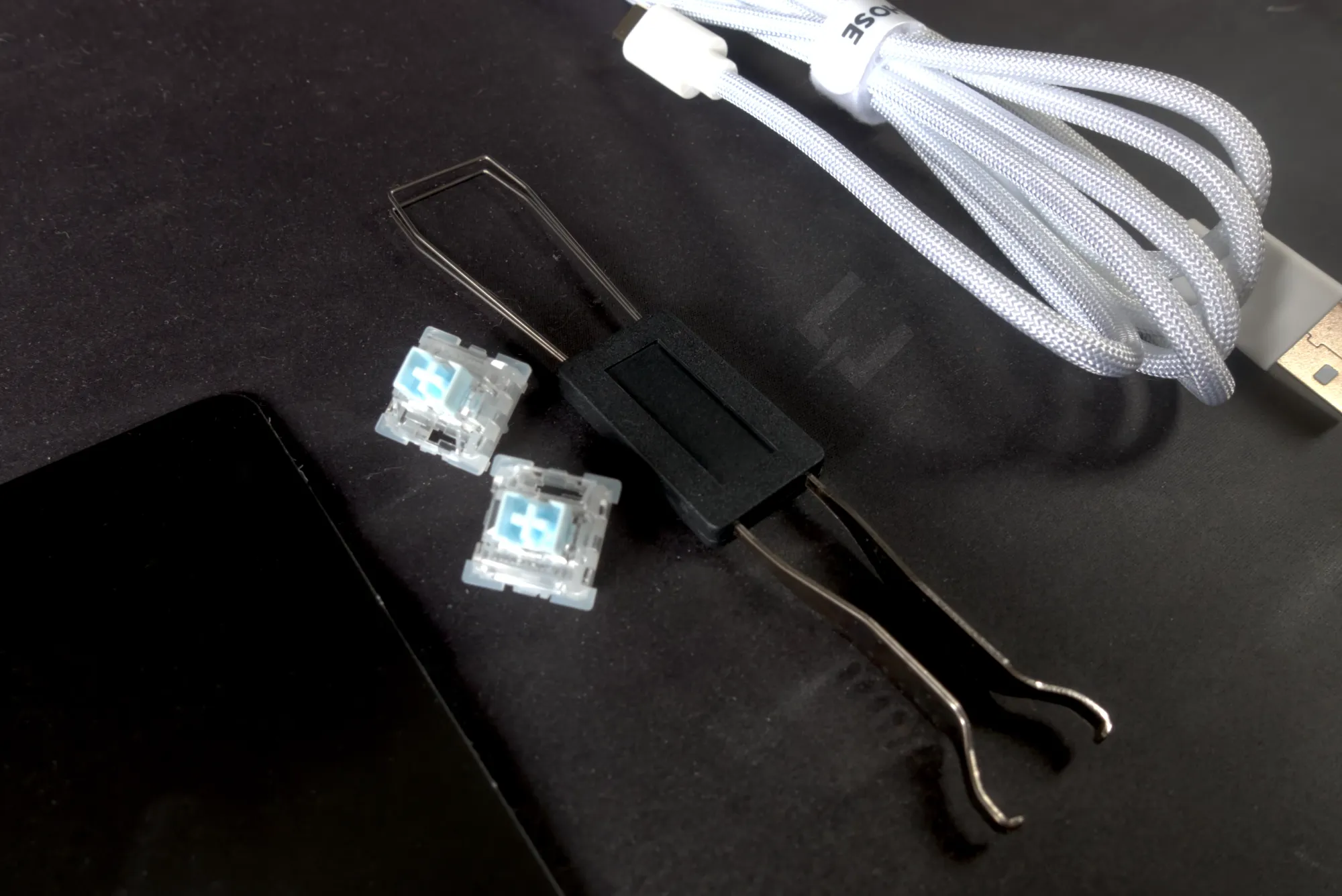 Enfin, parlons vite fait des accessoires inclus dans ce petit carton : on se retrouve avec 2 switches OUTEMU Ice Blue de remplacement, ainsi qu'un keycap puller générique qui semble avoir un petit peu de difficultés à récupérer les touches sans les abimer. Jusque la, rien de très choquant pour le prix. Mais il lui reste encore un dernier atout dans son jeu : son câble USB.
