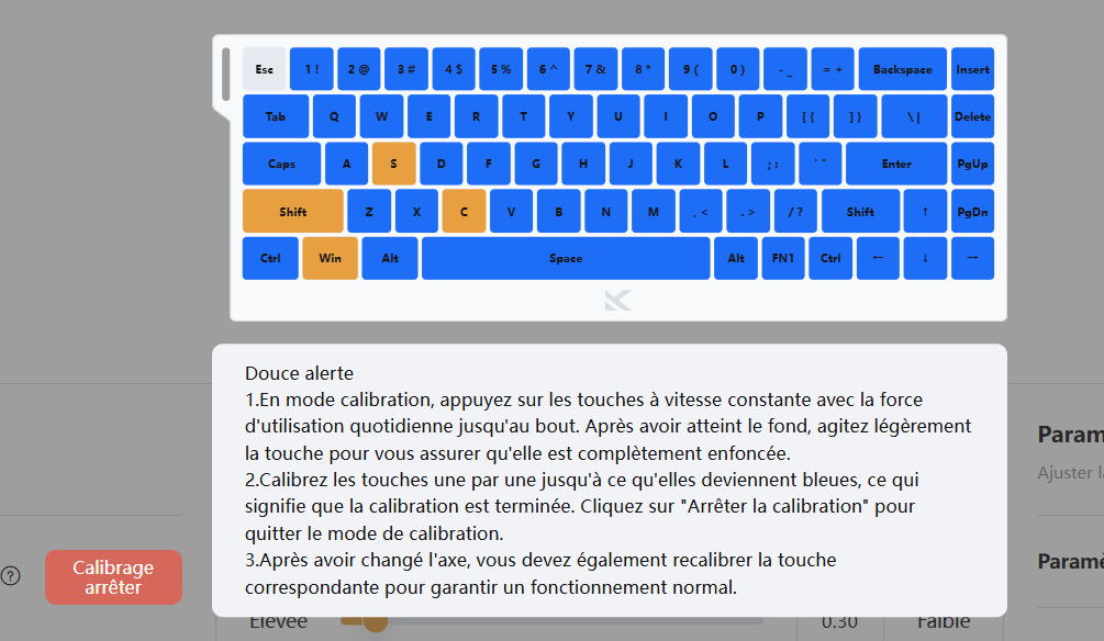 La mise à jour à duré environ 1 minute, sans aucune complication. Cependant, j'ai remarqué que beaucoup de mes touches avaient soudainement beaucoup de difficultés à s'activer soudainement, alors qu'il marchait très bien quelques minutes avant. Normal, comme l'application nous explique immédiatement qu'il faut recalibrer les touches du clavier avant de l'utiliser une bonne fois pour toutes ; de toute façon quand on achète du nouveau matériel, il est toujours important de prendre son temps, et le configurer à son aise.