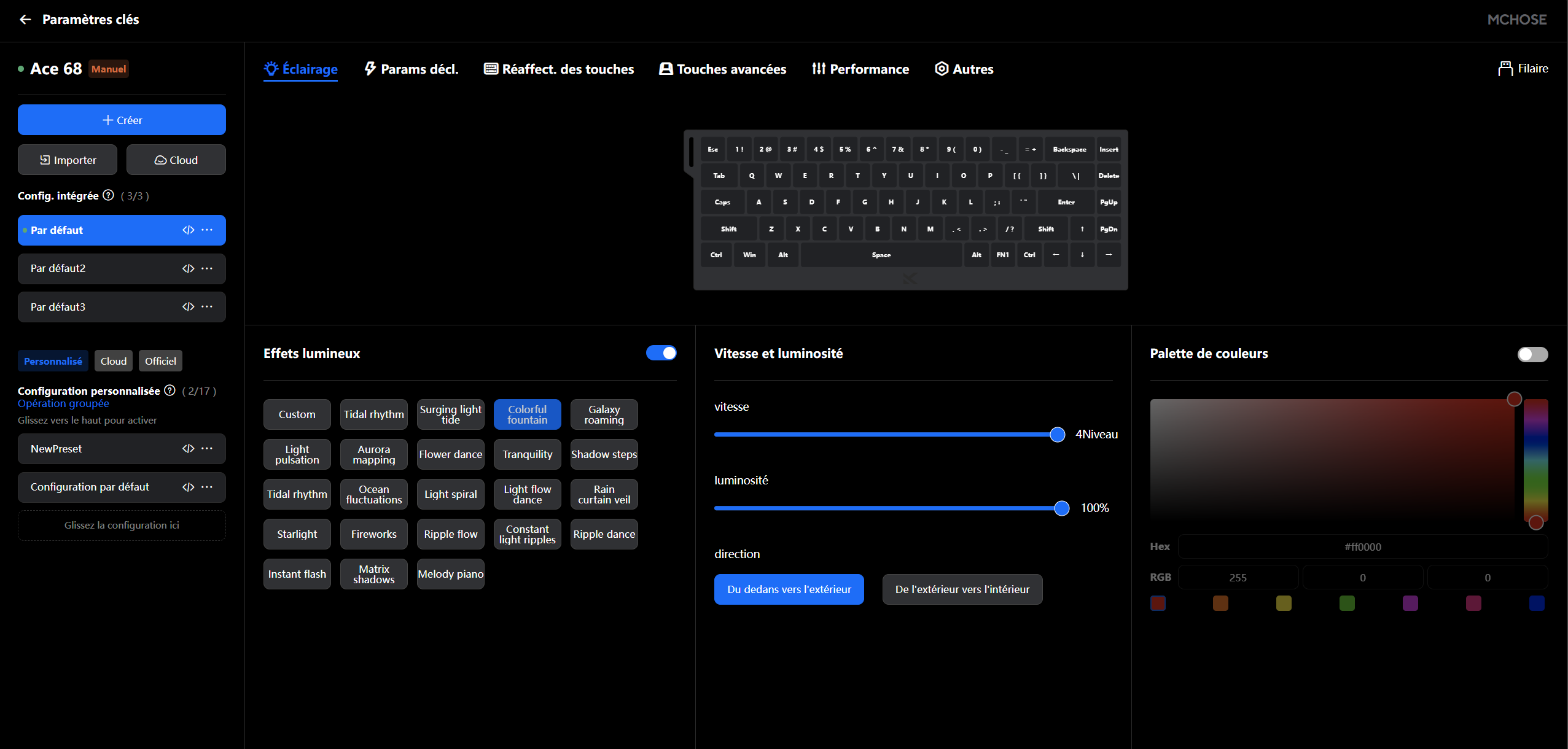 Parlons désormais du nerf de la guerre, sa configuration. Pour configurer les LEDs du clavier, l'application nous propose 22 effets lumineux en plus d'avoir un mode personnalisé. Les effets sont pour le moins classiques, mais ont quand même le mérite d'exister.