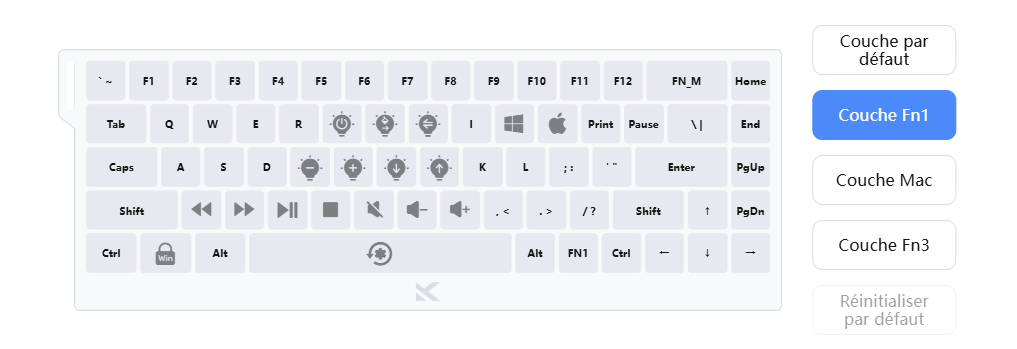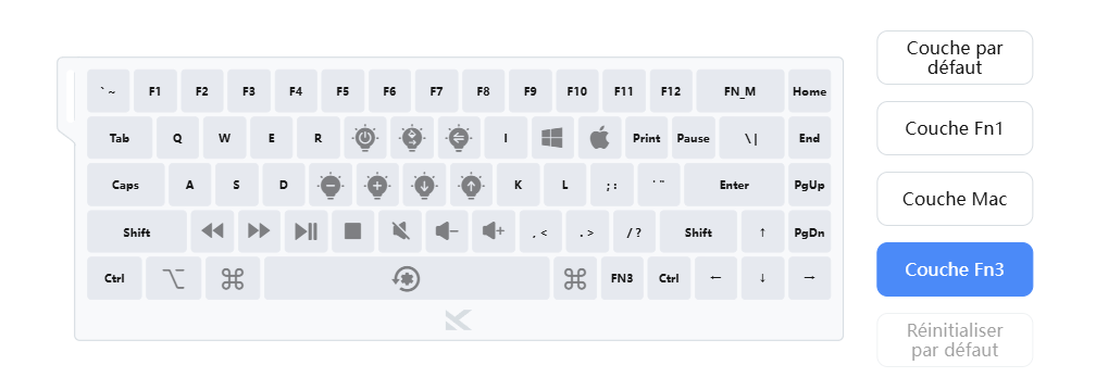 Au passage, vous avez remarqué la présence d'une couche FN3 ? C'est normal ; ce clavier possède un raccourci permettant de permuter entre le mode Windows (FN + O) et le mode MacOS (FN + P), avec pour chacun de ces modes, une sous-couche FN dédiée.