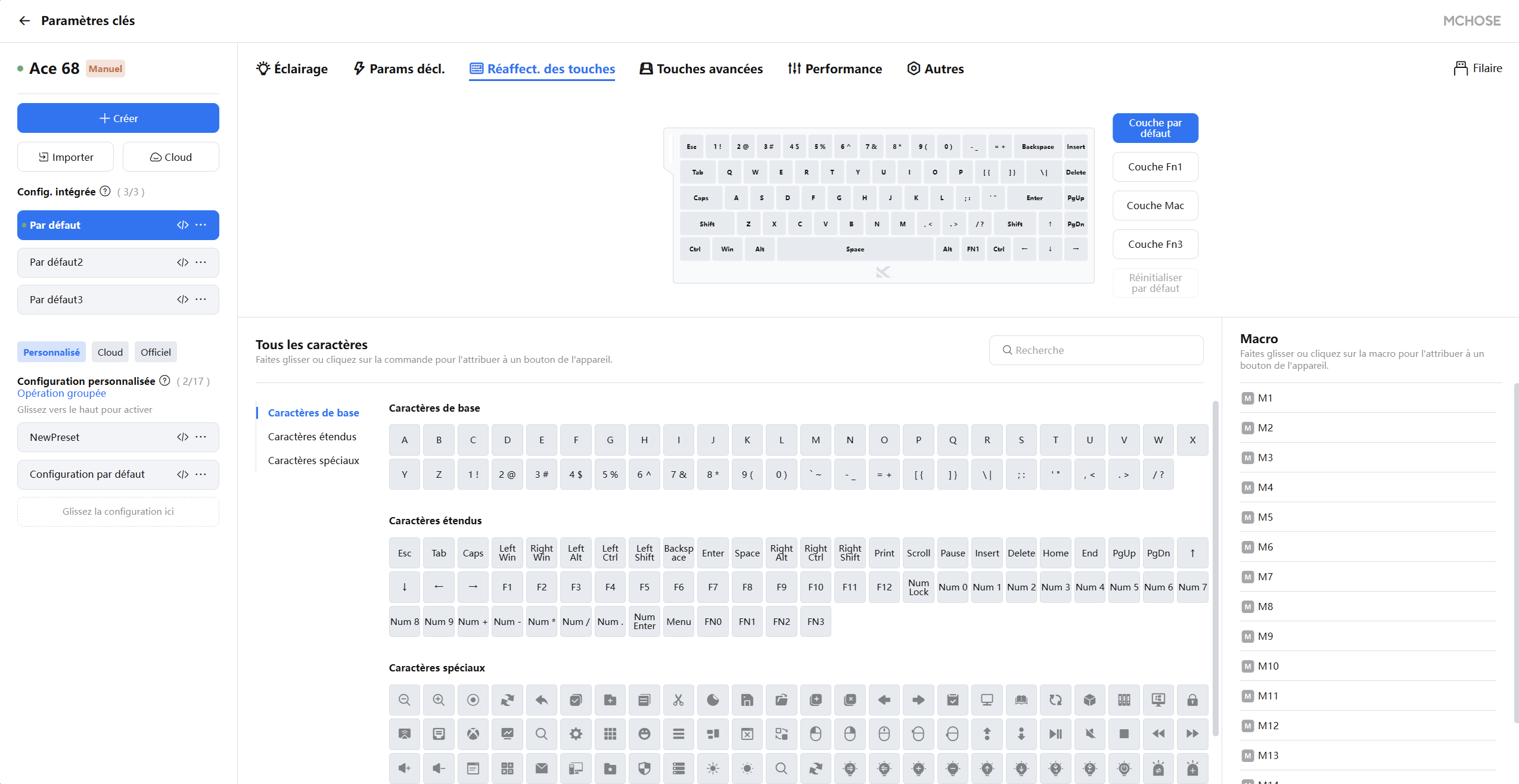 Encore une fois, fonctionnalité purement classique, mais le ACE68 permet de réaffecter des touches, ainsi que de créer divers macros. Cependant, à l'instar du FUN60, il est possible de réattribuer la totalité du clavier, que ce soit sur la couche par défaut comme la couche FN, ce qui est très interessant dans certaines situations (notamment dans la création de contenu).