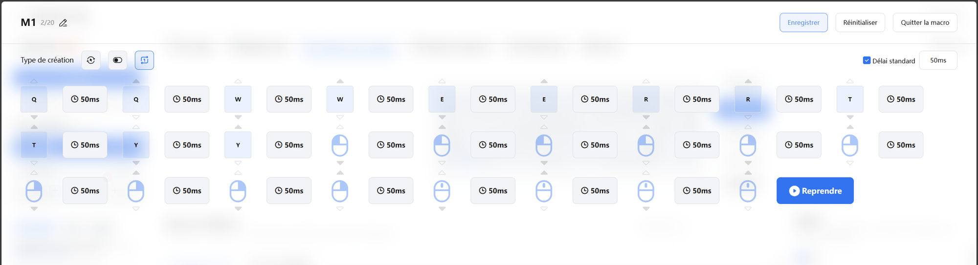 L'application permet aussi de créer jusqu'à 16 macros, en mettant le curseur sur l'onglet des macros en bas à droite ; l'enregistrement des touches est classique et intuitif, et il est possible de selectionner comment executer le macro, c'est à dire qu'on peut executer la macro tant qu'on maintient la touche enfoncée, ou qu'on fasse une permutation, ou simplement qu'en ne le lançant une seule fois. Une petite amélioration que j'aurais aimé voir : avoir la possibilité d'ajouter manuellement les touches, plutôt que d'être forcé à enregistrer les touches avant de pouvoir les modifier en post.