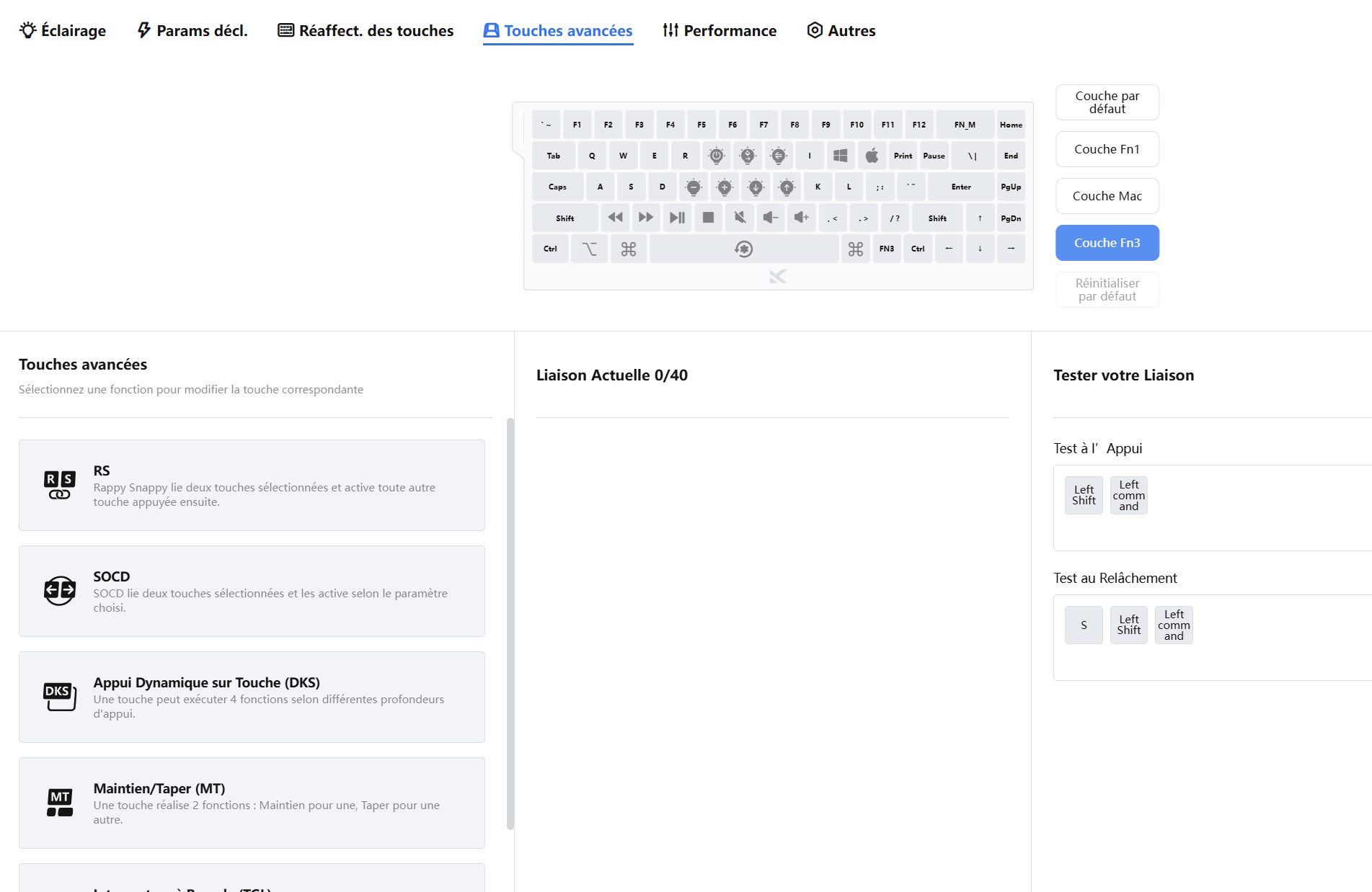 Si vous souhaitez profiter au maximum des fonctionnalités de votre clavier, vous allez être servis ; le ACE68, comme une très grande majorité des claviers type Hall-Effect, possède de fonctionnalités avancées, tels que les SOCD, le Rappy Snappy (qui sont toutes deux des fonctionnalités interdites dans divers jeux compétitifs comme Counter-Strike 2), mais aussi la possibilité d'avoir du DKS ou MT (permettant, en fonction de la profondeur d'appui, d'activer une touche), ainsi que le plus classique bouton à bascule (appuyer une fois pour activer, réappuyer pour désactiver).