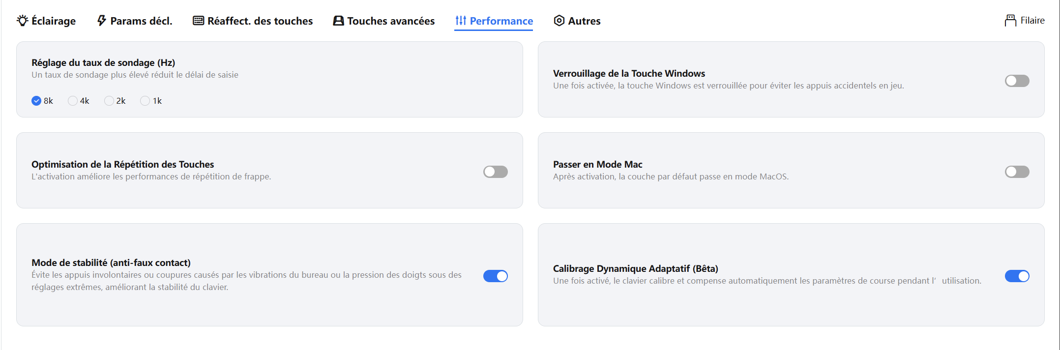 Concernant le menu des performances, on se retrouve avec des options classiques. On y retrouve le réglage du taux de rafraichissement (de 1k à 8k, ce qui est la norme pour un clavier pour joueurs à ce jour), contient diverses options pour empecher les répétitions de touches (car pour un clavier H-E, ca peut arriver bien plus qu'on ne le pense s'il est mal configuré), ainsi qu'une option permettant d'activer par défaut le verrouillage de la touche Windows en plus du mode Mac.