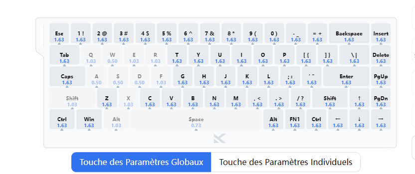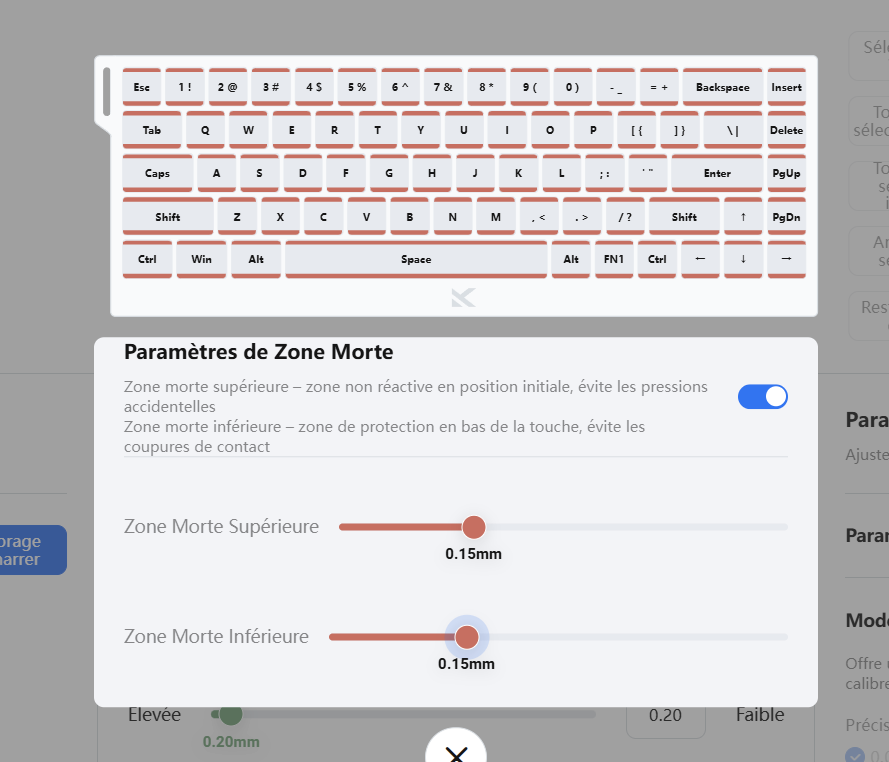 Quand il s'agit de configurer l'activation des touches, sachez que vous pouvez régler son point d'activation n'importe où, que ce soit dans sa globalité, ou pour une seule touche, de 0.1mm à . Pratique si vous voulez n'avoir par exemple que ZQSD de sensible, mais pas les autres touches autour. Cela dit, conseil : mettez un jeu à côté, testez la sensibilité, jouez en FFA autant que possible, et affinez les valeurs si ca ne vous va pas.