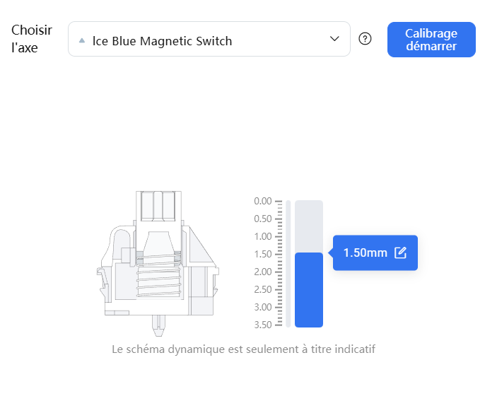 Pour commencer, MChose propose divers presets pour une selection de switches magnétiques tels que Kailh ou TTC, afin de configurer la distance recommandée par défaut du fabriquant ; mais vous avez aussi la possibilité de mettre votre propre configuration si vous le souhaitez. Bien sur, assurez-vous que les spécificités de la touches soient bien corrects, afin d'éviter tout problème de sensibilité.
