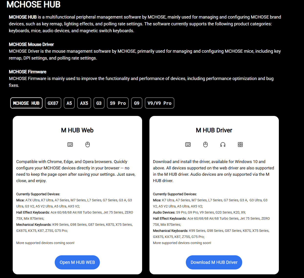 Donc, histoire d'être un peu plus moderne, on va donc configurer notre appareil directement via le web, via leur site https://wwww.mchose.com.cn/ . Ici, aucun driver est necessaire pour pouvoir configurer l'appareil, il faut juste un navigateur basé sur Chrome (Edge, Google Chrome, Brave, etc...) ; tout autre navigateur comme Firefox n'est donc pas supporté. D'ailleurs, l'application via le web fonctionne aussi sur MacOS ou Linux, pas seulement Windows. C'est un bon point à noter pour les amoureux de la pomme ou du pingouin.